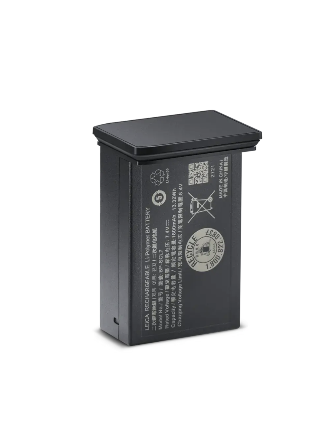 Con una capacidad de 1.800 mAh, la batería BP-SCL7 de Leica ofrece un aumento de la capacidad de aproximadamente un 64% en comparación con su modelo anterior, lo que permite un mayor tiempo de funcionamiento entre recargas, así como una carga USB-C más rápida. El resultado: el máximo rendimiento de la batería en un diseño compacto.