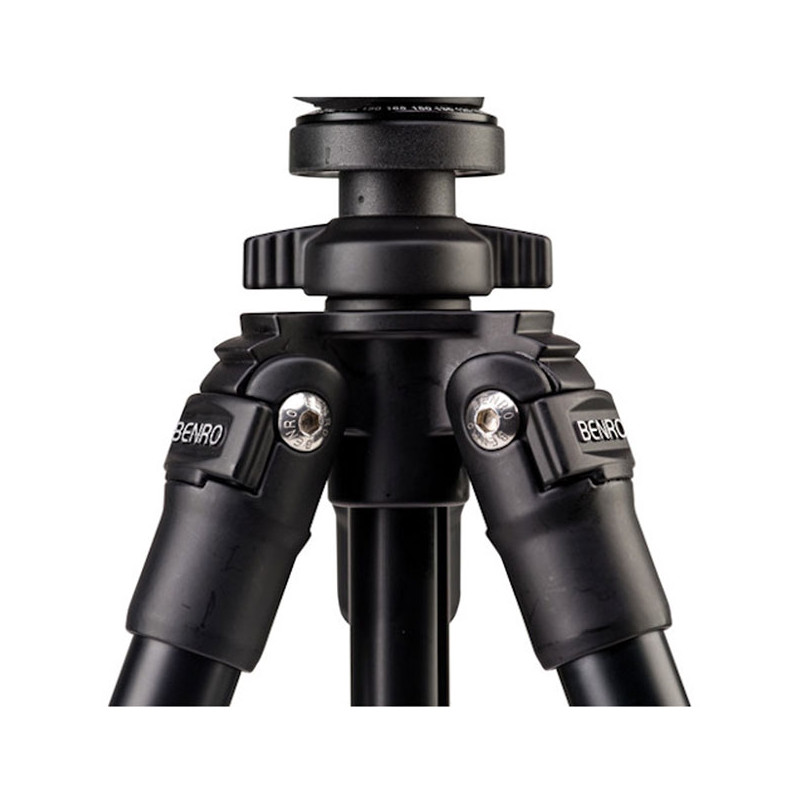 Las secciones de las patas siguen firmemente en su lugar gracias al bloqueo giratorio. El trípode tiene un cabezal con una placa de liberación rápida compatible con Arca-Swiss.
