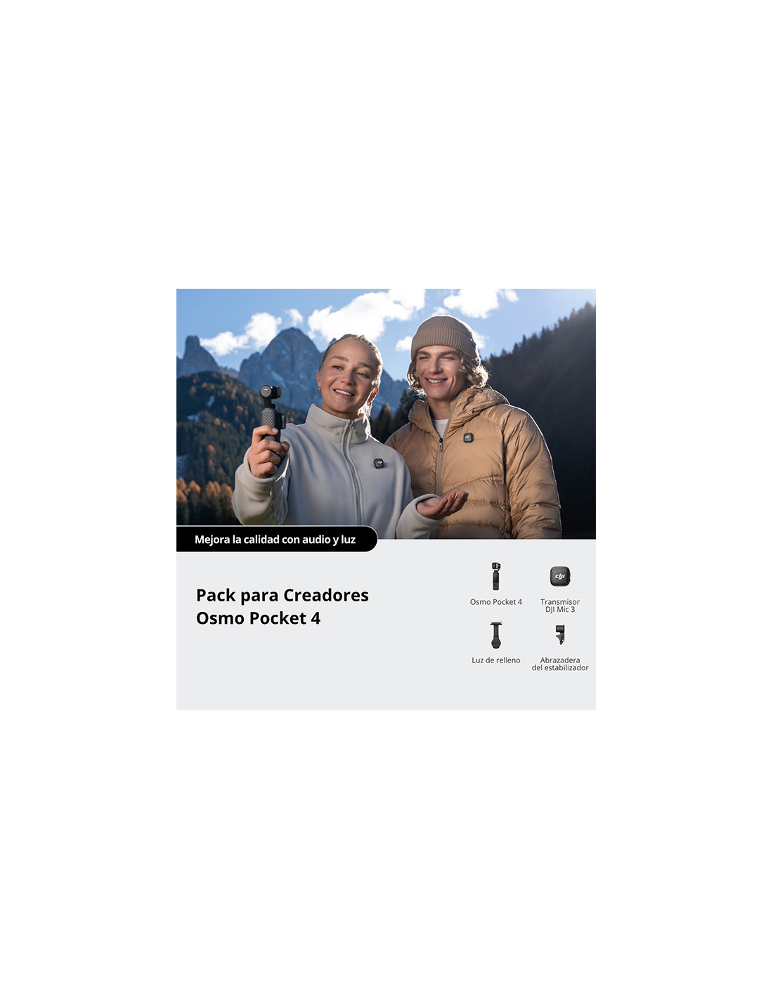 INCLUYE un microfono DJI Mic 3, luz de relleno, objetivo gran angular, minitripode Osmo