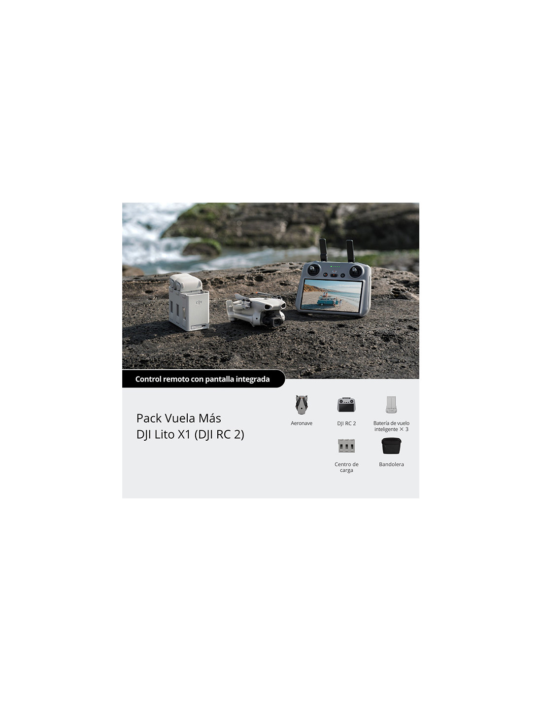 Incluye Mando DJI RC2 con pantalla, 3 baterias de vuelo inteligente, un centro de carga, una bolsa de bandolera, y mas.