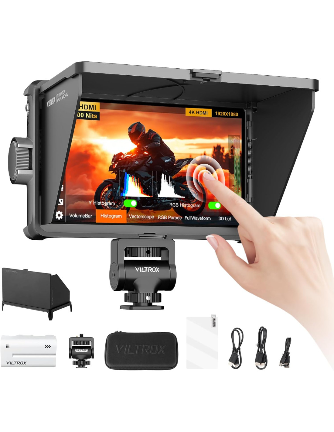 VILTROX DC-A1 cámara monitor Equipado con una pantalla de alto brillo de 2800 Nits recientemente actualizada,el ultra brillo sin falso estándar abre un nuevo capítulo de brillo.El rendimiento de brillo superior garantiza que las imágenes permanezcan visibles en entornos de iluminación brillantes o complejos,proporcionando a los fotógrafos una experiencia de supervisión inigualable.