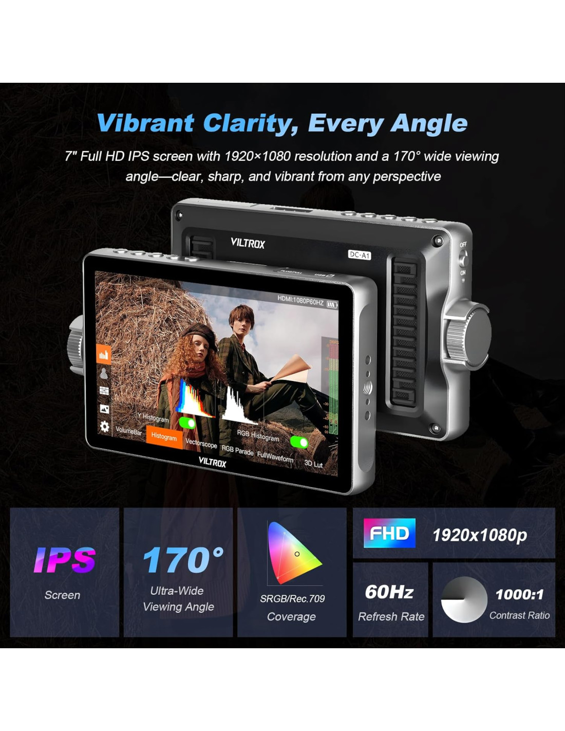 - VILTROX DC-A1 tiene calibración de pantalla de grado Apple, mayor precisión de color,mejora ilimitadamente la reproducción real de los colores de la imagen.Relación de contraste de 1000:1,frecuencia de actualización de 60Hz,cobertura de gama de color profesional SRGB.